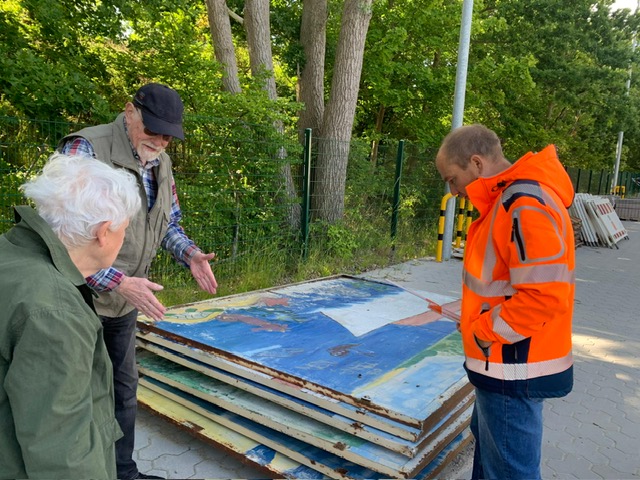 3. Oktober: Eigentlich müsste man noch die Jahreszahl dahinter setzen „2025“. Es gibt nämlich viele Vorgeschichten zu den bemalten Platten, die zwischen dem WIRO -Parkplatz und der Straße in Richtung Yachthafen und zur Jugendsportschule bis vor wenigen Monaten ihren Platz hatten.